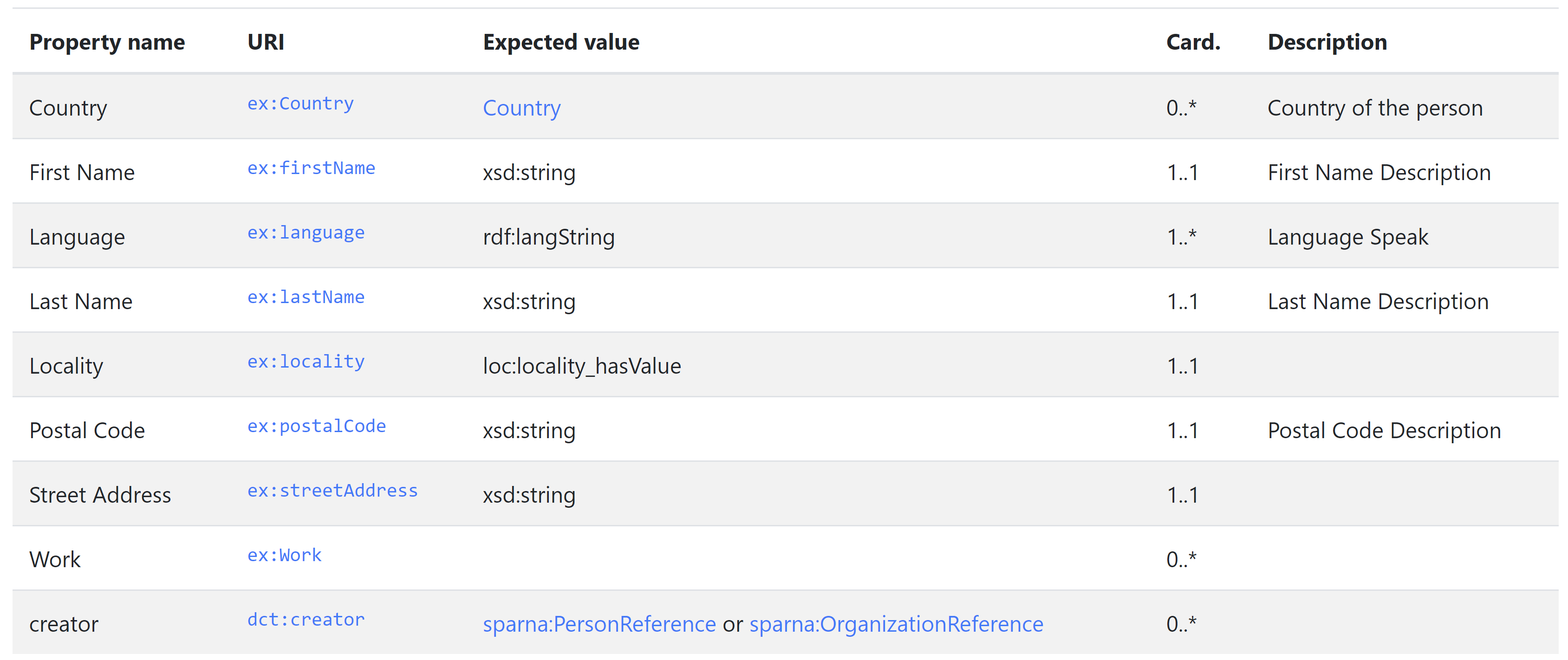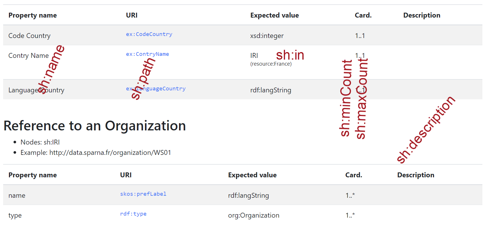 xsd:string | No | Populates the Description column of the table. If not provided, and if sh:path points to a URI, then a skos:definition or rdfs:comment